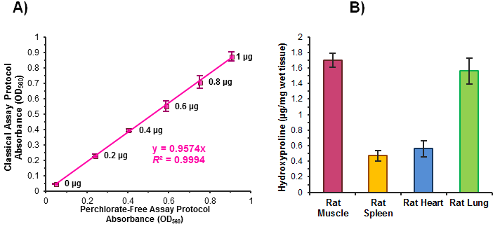 Figure (A). 經(jīng)典高氯酸法檢測的試劑盒(k555-100)和無高氯酸法檢測試劑盒(k266-100)的標(biāo)準(zhǔn)曲線之間的相關(guān)性比較。數(shù)據(jù)顯示此兩種檢測方法具有非常好的相關(guān)性(R2 > 0.999)。 (B). K266-100試劑盒檢測大鼠樣本中的總羥脯氨酸的含量。