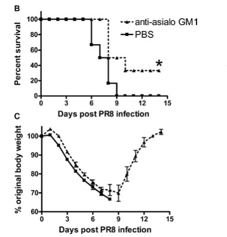 文獻來源:Zhou G, et al. 2013. Eur. J. Immunol. 43:929. 該圖顯示尾靜肪注射anti-asialo GM1PBS,同時用流感病毒處理,并且每天監測小鼠存活率(B)和小鼠體重(C)。顯示,消耗NK細胞增加流感病毒感染小鼠的致病率和致死率。