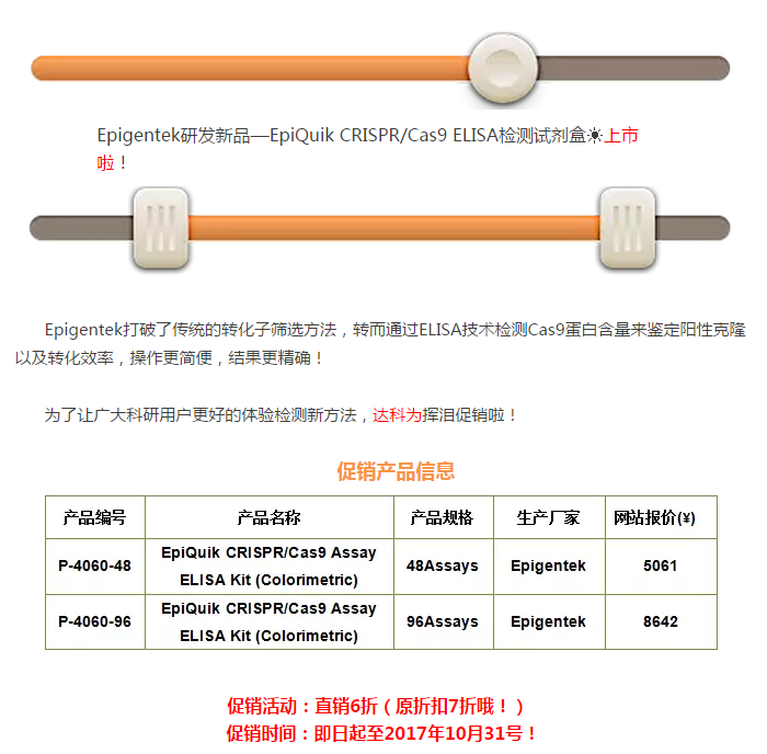 傳統方法操作復雜、花費大量時間與精力,針對這個特點,Epigentek研發出了通過ELISA檢測Cas9蛋白含量,進而篩選轉化子的檢測試劑盒。該試劑盒僅需要純化的Cas9 核酸酶和全細胞提取物(分離自各物種的組織和培養的細胞),就能夠特異性定量檢測CRISPR相關蛋白9(Cas9,dCas9)。