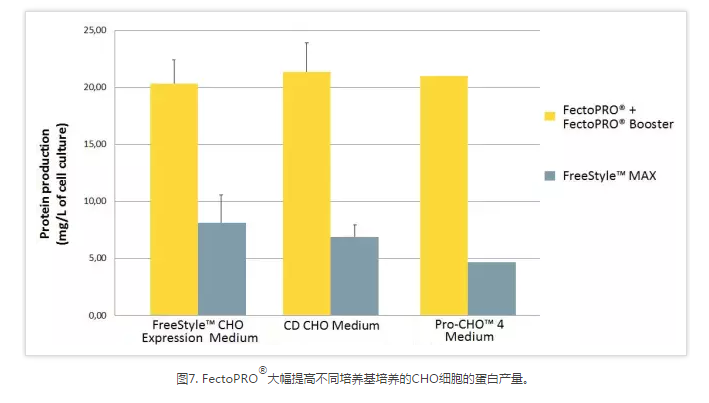 圖1. FectoPRO?大幅提高懸浮CHO細胞的抗體產(chǎn)量。按1×106個細胞/ml的密度將細胞培育在30ml的無血清培養(yǎng)基中,并依照每種試劑說明書推薦用量FectoPRO?(0.8 μg DNA/ml)或FreeStyle?MAX試劑(1.25 μg DNA/ml)進行轉(zhuǎn)染。用蛋白質(zhì)G生物感應器(fortéBIO? octet RED96 system)對重組小鼠IgG的產(chǎn)量監(jiān)測1~6天?!狿roteoGenix SAS(法國)提供的數(shù)據(jù)。