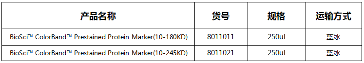 BioSciTM ColorBandTM Prestained Protein Marker產品應用于SDS-PAGE凝膠電泳時,可實時監測蛋白樣品的分離情況,也可以用于評估Western轉膜(PVDF、尼龍或硝酸纖維素膜)效率,并粗略的估計蛋白樣品的分子量。