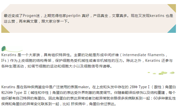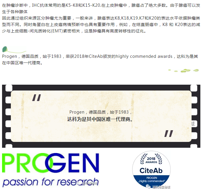 Progen可提供130多種Keratins抗體以及標準品, 抗體包括單抗、多抗,可用于IHC/WB多種應用。
