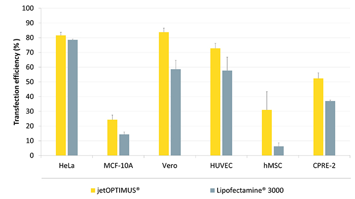 △圖1. jetOPTIMUS?有效提高難轉細胞的轉染效率。根據L3K和jetOPTIMUS?說明書要求進行轉染,在24孔板中轉染GFP質粒到多種細胞系,24小時后采用FACS檢測轉染效率。