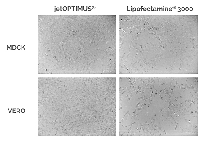 △圖2. 使用jetOPTIMUS?轉染24小時后,細胞仍然健康并保持良好形態。根據L3K和jetOPTIMUS?說明書要求進行轉染,24小時后在相差顯微鏡下觀察MDCK和VERO細胞的狀態。