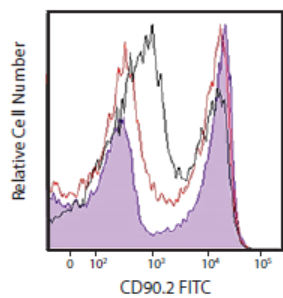 (將小鼠脾臟細胞分別用TruStainFcX TM PLUS(0.25μg/test,紫色填充直方圖),TruStainFcX TM(克隆93,1μg/test,紅線)封閉之后用CD90.2FITC染色,與未處理的小鼠脾臟細胞(黑線)作比較。結果顯示TruStainFcXTM PLUS封閉效果更優。)
