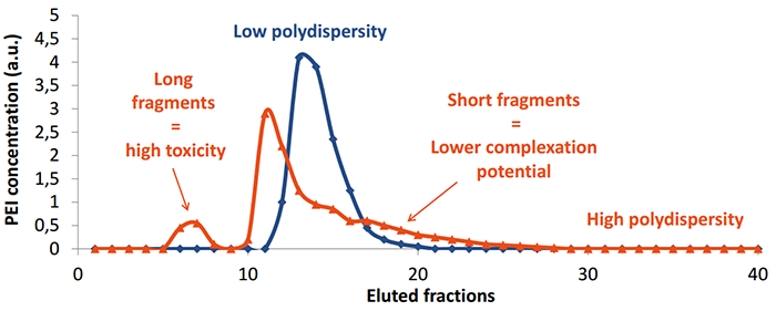 由于長(zhǎng)片段的PEI對(duì)細(xì)胞有毒性,而短片段PEI結(jié)合DNA能力較差(見(jiàn)紅色),所以?xún)?yōu)化PEI的片段大小,降低其分散性能減少細(xì)胞毒性,同時(shí)增加結(jié)合DNA的能力(見(jiàn)藍(lán)色)和轉(zhuǎn)染重復(fù)性。