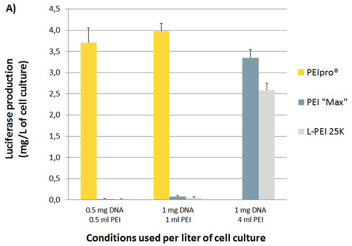 • 與其它PEIs相比,PEIpro?所需更少轉(zhuǎn)染試劑和較少/相似的DNA用量
