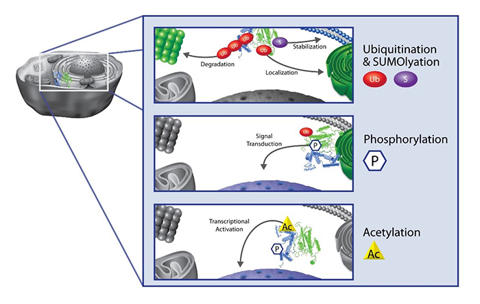 盡管目前已知的PTM的種類超過400種,但只有少數(shù)幾個被詳細研究過,主要包括甲基化、磷酸化、乙酰化、泛素化和SUMO化,它們被證明是幾乎所有細胞的關(guān)鍵調(diào)節(jié)因素,包括信號轉(zhuǎn)導、表觀遺傳學、基因和蛋白質(zhì)表達、蛋白質(zhì)穩(wěn)定性和定位以及細胞免疫。