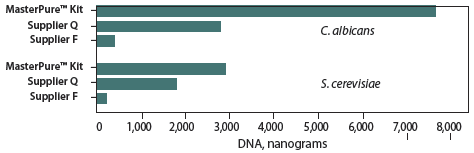 分別提取S.cerevisiae和C. albicans.中的DNA,用熒光染料33258對DNA進(jìn)行定量分析(RNA對該定量幾乎沒有影響)。圖中顯示的是兩次實驗的平均DNA得率 。MasterPure Kit對C.albicans的提取量相比其它試劑盒高17倍;對S. cerevisiae的提取量相比其它試劑盒高12倍。