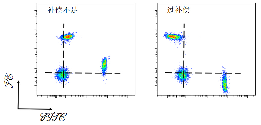 對于熒光補償的確定,需運用以上補償的基本原理并結合特定的標本來實現。以FITC,PE雙色分析為例: