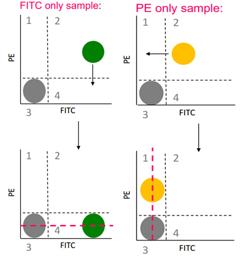 (3)PE單染管:同理,將進(jìn)入FITC探測器的PE信號通過補(bǔ)償調(diào)節(jié)來消除。