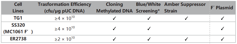 試用裝包含3種電轉感受態細胞【TG1, SS320 (MC1061 F'), ER2738】,每種感受態各4個反應;