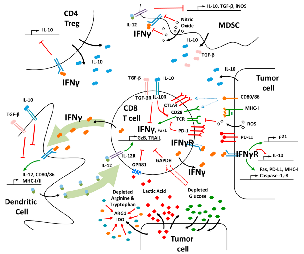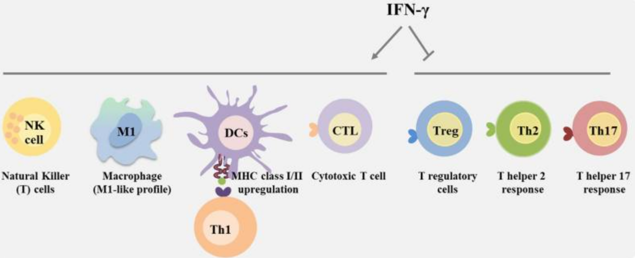 IFN-γ信號通路協調多種生物反應,在先天和適應性免疫中扮演的重要角色。IFN-γ可以通過促進Th1細胞、CD8+T淋巴細胞、NK細胞、樹突狀細胞及巨噬細胞的活性,抑制Treg、Th2和Th17細胞分化和功能,發揮免疫調節作用。此外,IFN-γ可激活巨噬細胞,使其分化為M1型巨噬細胞。